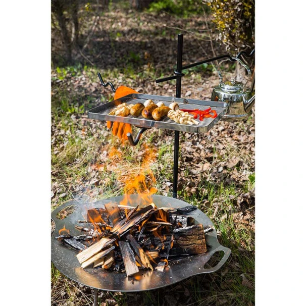 Il s’agit d’un braséro polyvalent en acier : vous pouvez à la fois cuisiner de délicieuses grillades, une poêlée juteuse, ou tout simplement préparer un feu.