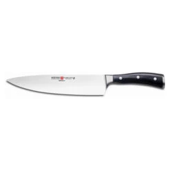 Ce couteau de cuisine au manche en bois foncé donne un aspect élégant.