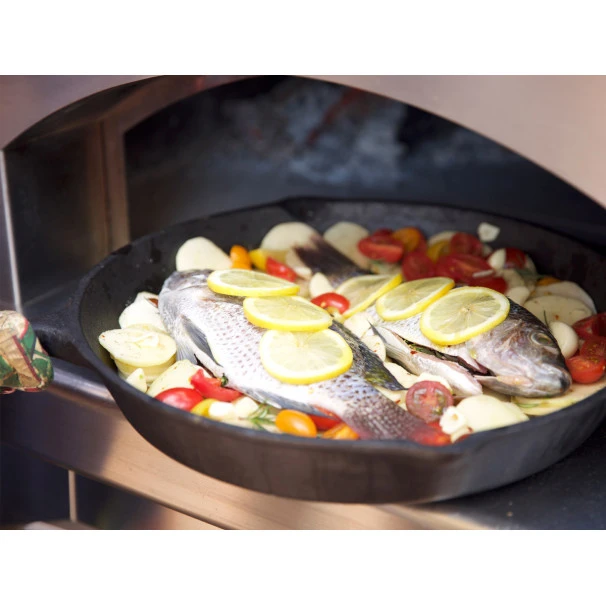 Double corps en acier réfractaire garantie la longévité de l’ensemble du barbecue four à pizza. La sole foyère est constituée de chamotte (pierre réfractaire) alimentaire. Cela garantit une cuisson parfaite de la pâte, à la fois onctueuse et croustillante.