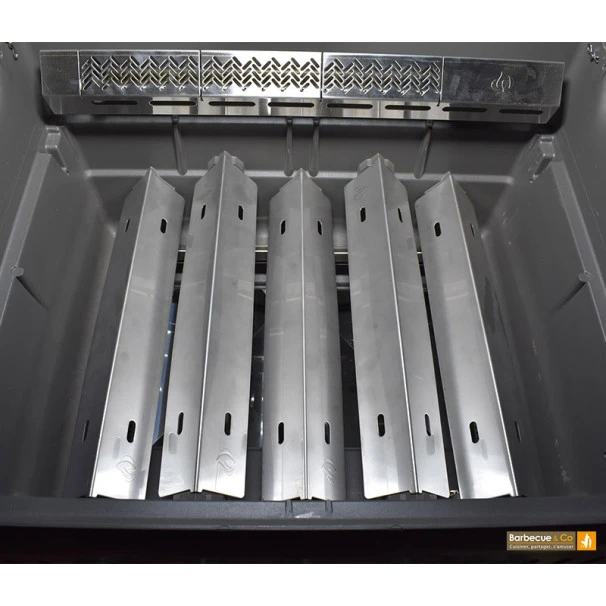 Organisés en deux niveaux, l’installation des caches brûleurs du barbecue Napoléon permet une circulation homogène de la chaleur jusqu’à la surface de cuisson. Pour optimiser, l’homogénéité de la chaleur, les caches brûleurs sont positionnés en sens montant dans la direction arrière vers l’avant. Cela permet à la chaleur de la zone arrière d’être poussé vers l’avant où l’air est plus froid.