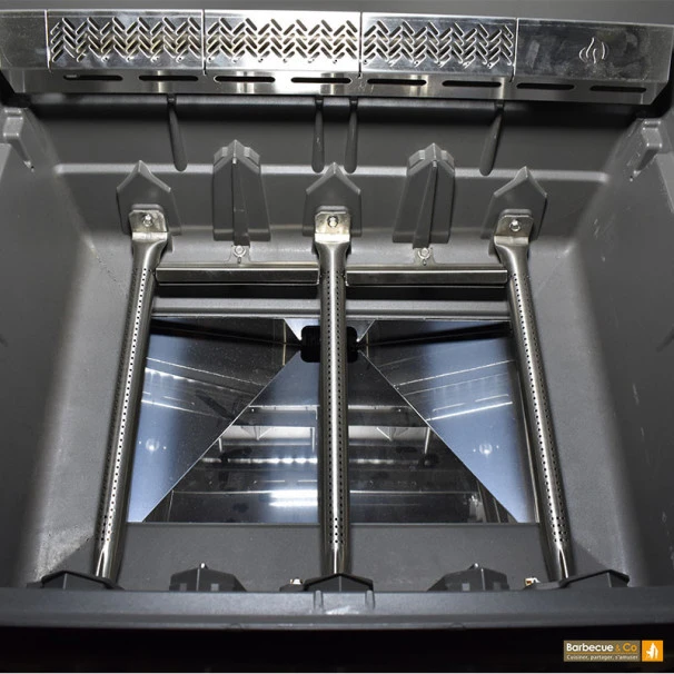 - 3 brûleurs principaux en inox indépendants, 1 grand brûleur infrarouge Sizzle Zone™ et 1 brûleur infrarouge arrière, vous pourrez griller ou cuisiner de nombreux plats simultanément.