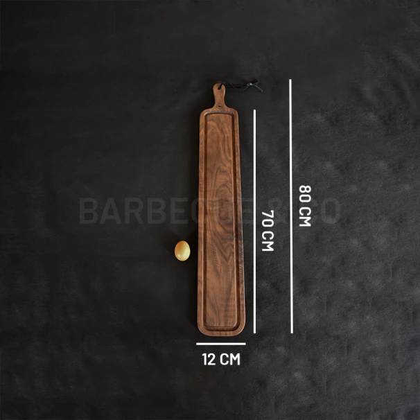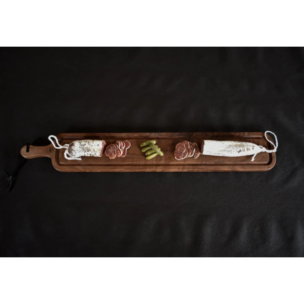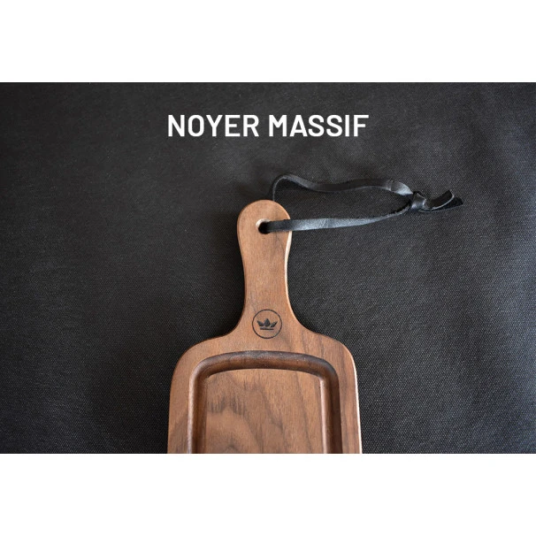 Cette planche à découper a été constitué en noyer massif et finit à l’huile de pépins de raisin. Elle est à la fois élégante et solide.