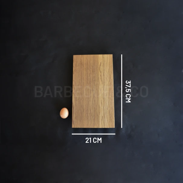 Présentation de la planche plateau épaisse en bois de chêne foncé 21 x 37.5cm