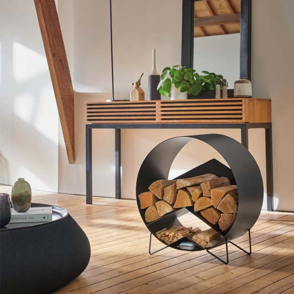 Ce rangement d’intérieur pour bûches est inspiré des rosaces des églises toscanes et de l’architecture japonaise. Tout en rondeur et en géométrie, ce range bûches possède 3 compartiments bien segmentés. Sa structure en acier et ses lignes arrondies en font un très bel objet d’intérieur. Sa couleur « noir givré » associée à son dessin industriel chic s’accorderont parfaitement avec des poêles, des cheminées modernes ainsi que des cheminées plus traditionnelles, en pierre ou en métal.